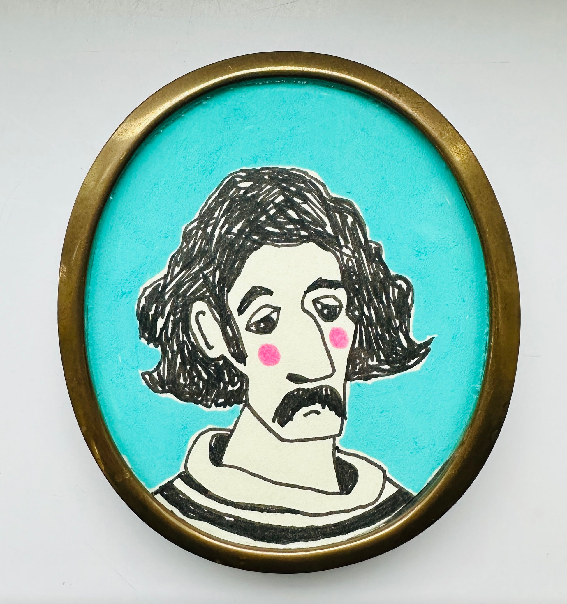 Notes on the Artwork: Inspired by the 18th century tradition of giving beautiful miniature portraits to loved ones, Beloved is a slightly morose man given to the love of his life but in 2025.