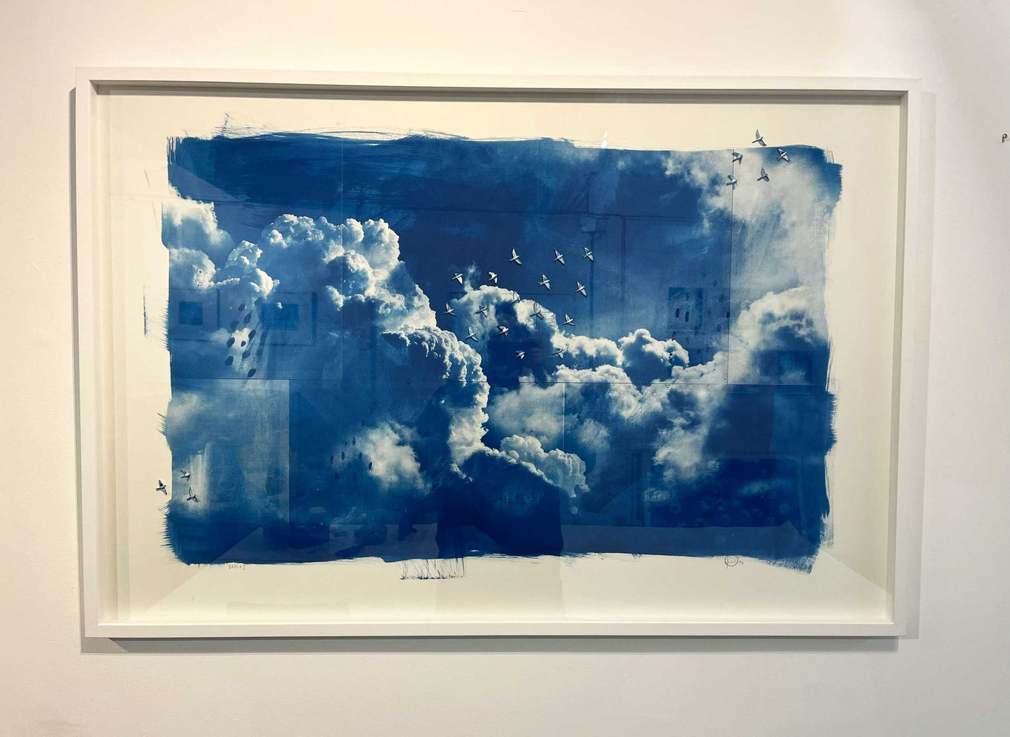 One off Cyanotype print hand finished with collaged birds. Framed.