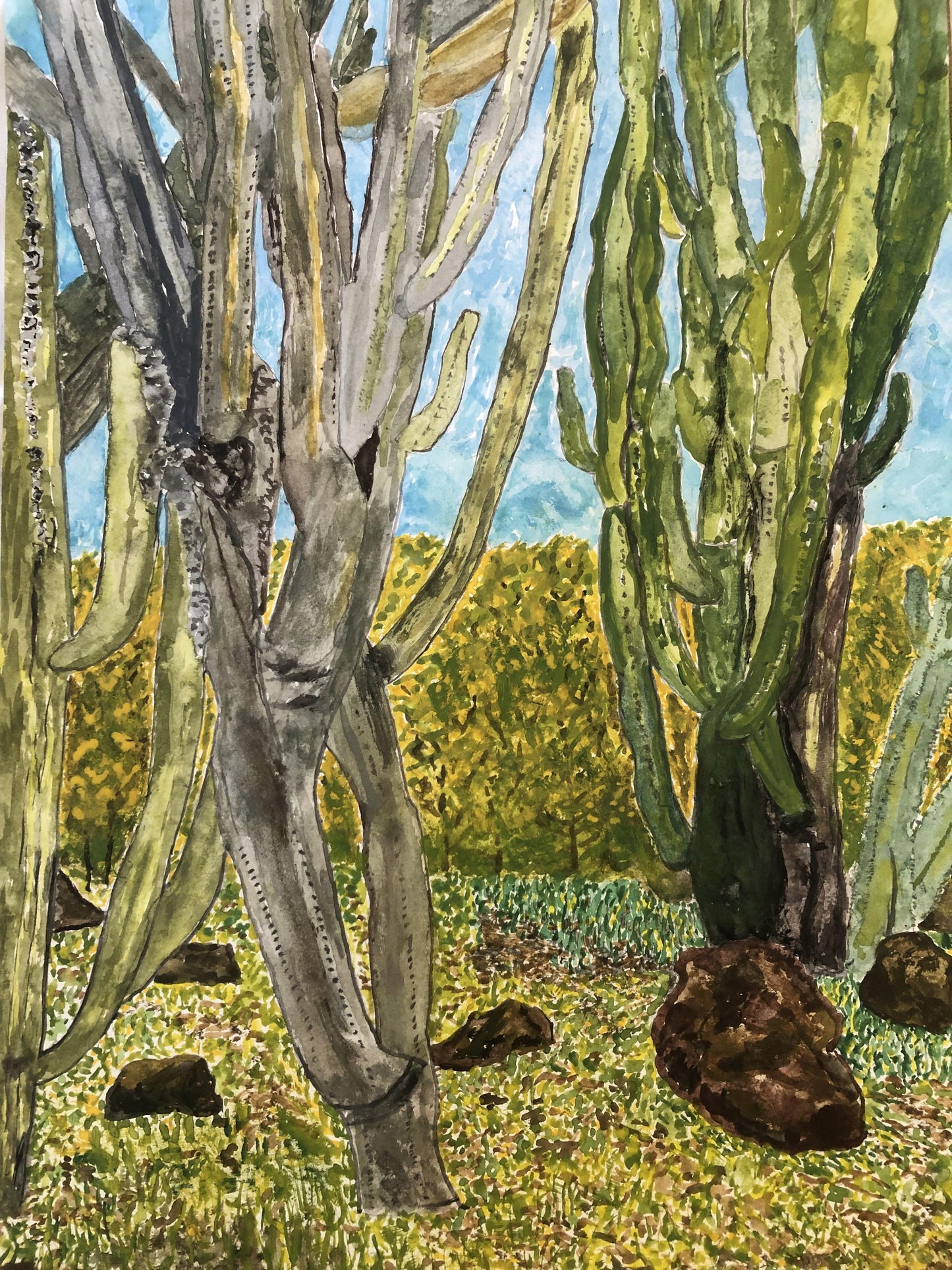 Notes on the Artwork: This artwork features cactus plants in a Madeira Garden. It would make a fabulous addition to any living space. Framed with museum glass.