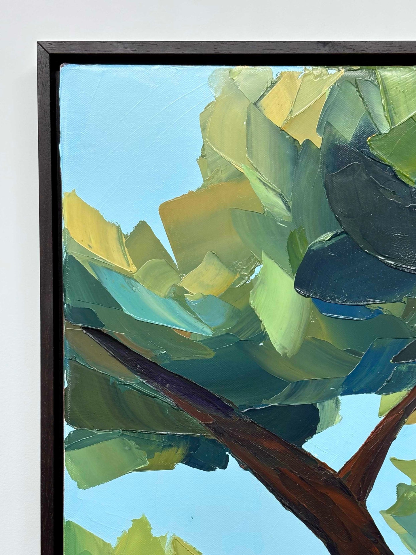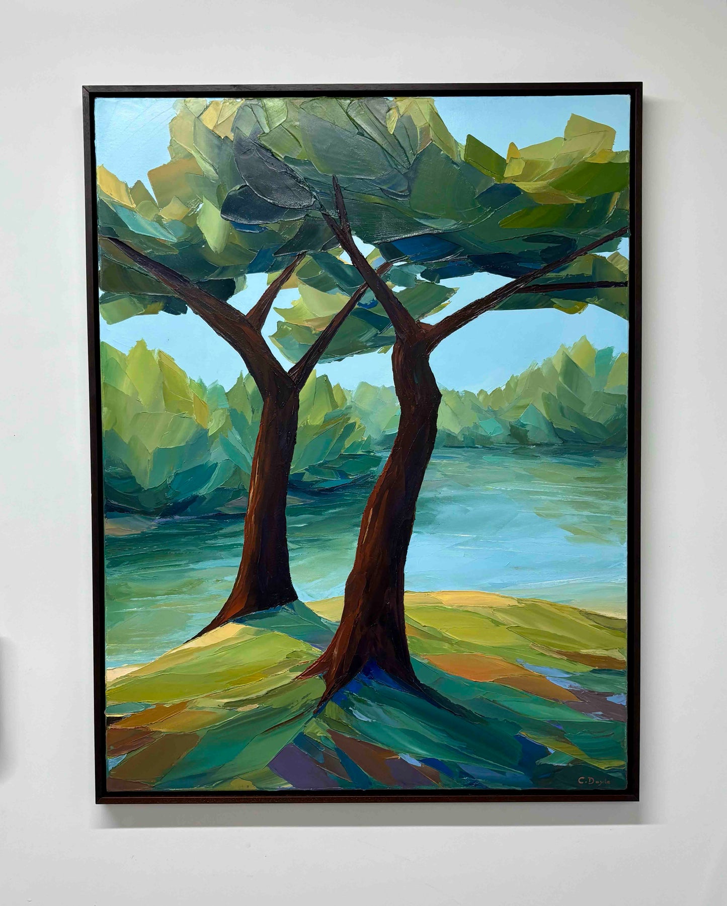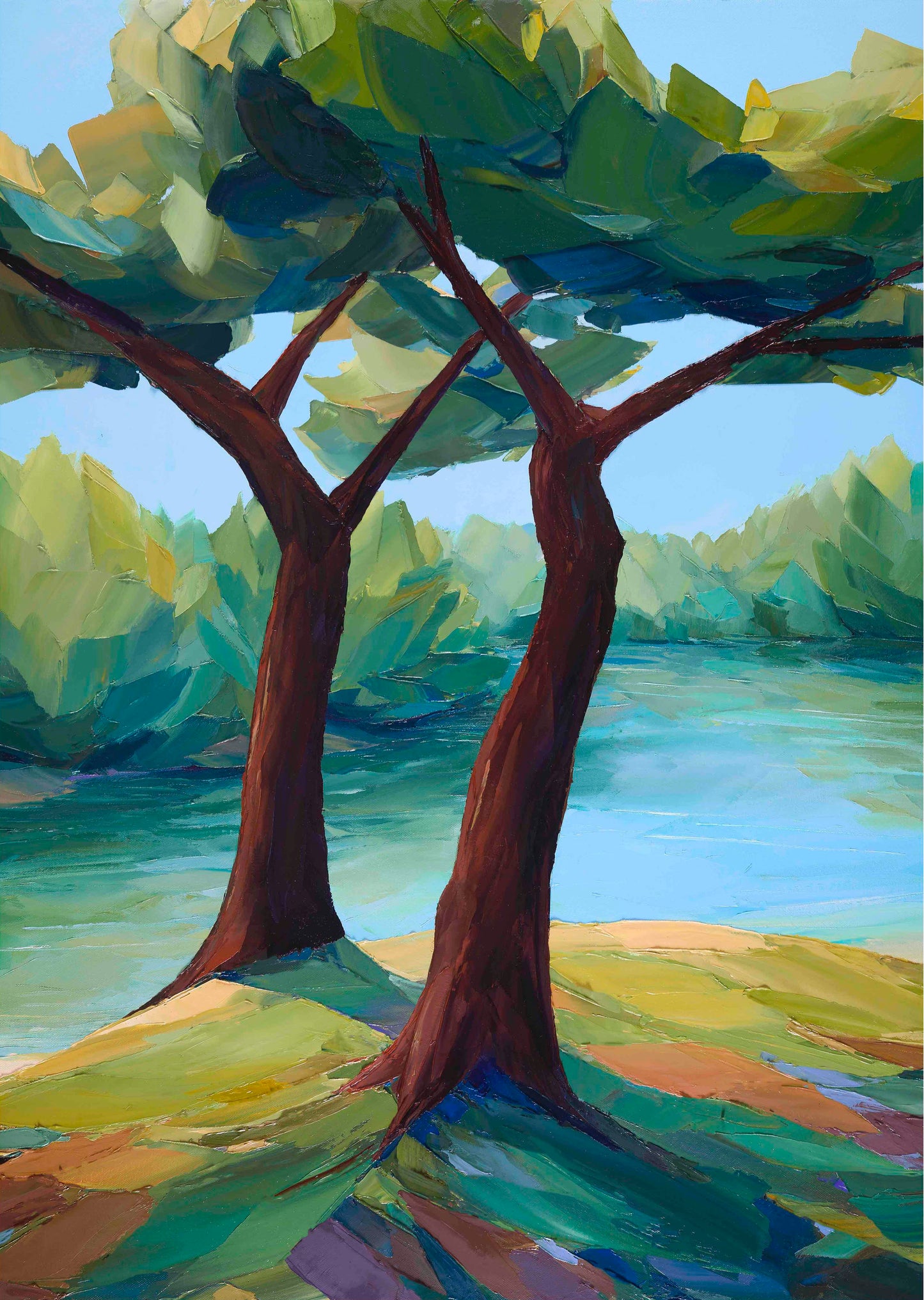 Notes on the Artwork: Loosely inspired by two trees in the Leyton Flats parkland, the painting depicts a pair of twisting trees overlooking a still body of water. The level of detail gradually diminishes toward the background, creating a sense of perspective within the composition. This is further emphasised by a shift in colour vibrancy, with tones becoming more muted as they recede into the distance, drawing attention to the dancing trees as the focal point of the painting.
