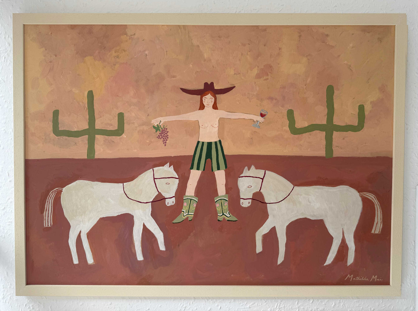 Notes on the artwork: Ideal for living rooms, dining areas, or above a mantelpiece, Dancing with Horses brings energy, humour, and a subtle elegance to any space. Its inviting tones and playful composition make it a conversation starter, while its timeless simplicity ensures it complements a wide range of decor styles.