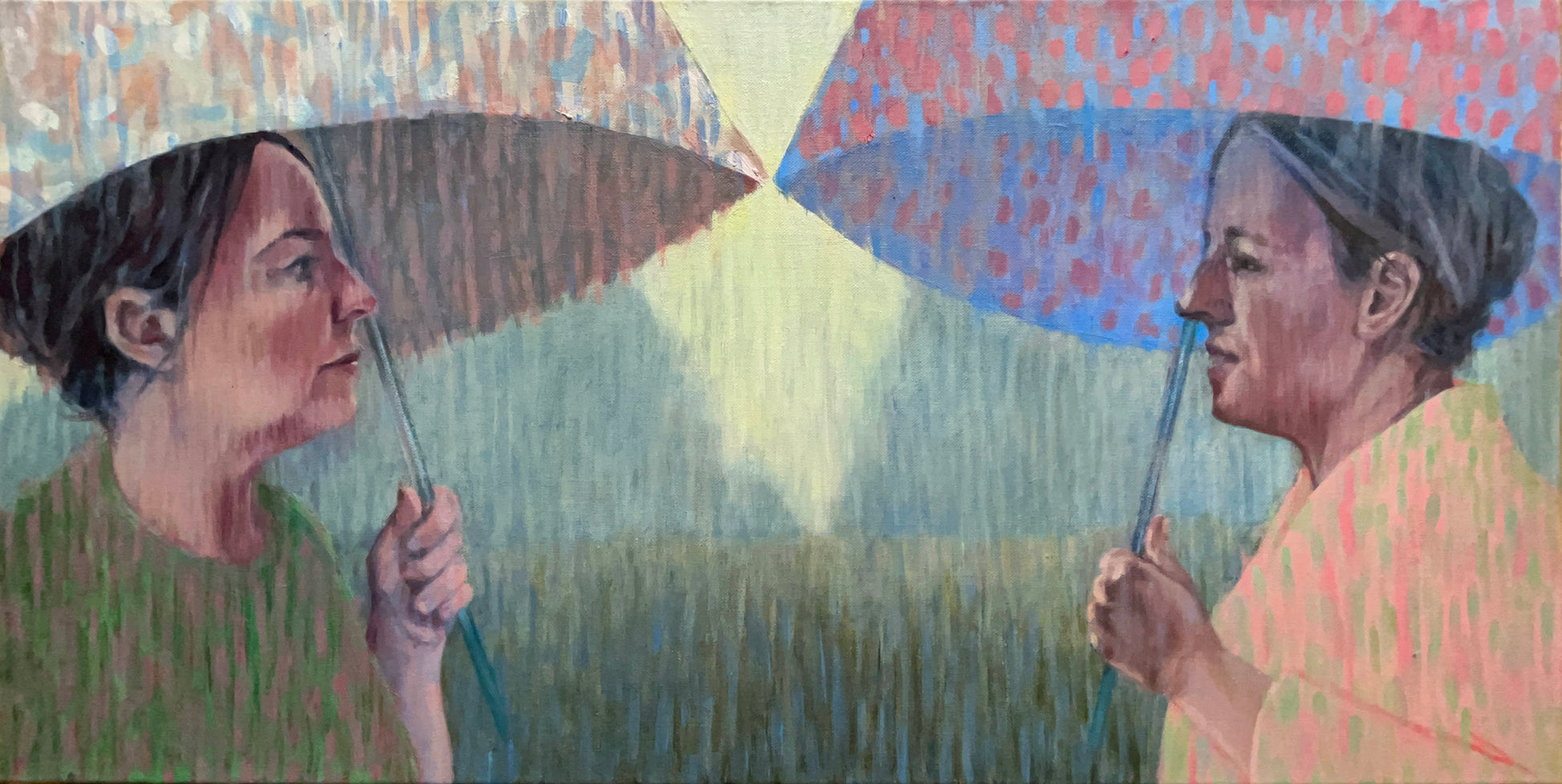 Notes on the Artwork: This piece, 'Equidistant Pleasantries' is from my rain collection which features usually lone women enveloped and separated by their umbrellas. This painting depicts the barrier to deeper communication between women, where time restriction (juggling work and family) leaves only space for fleeting exchanges and pleasantries. Here, the two are restricted by the umbrellas, only able get as close as the umbrellas allow, only able exchange so much.