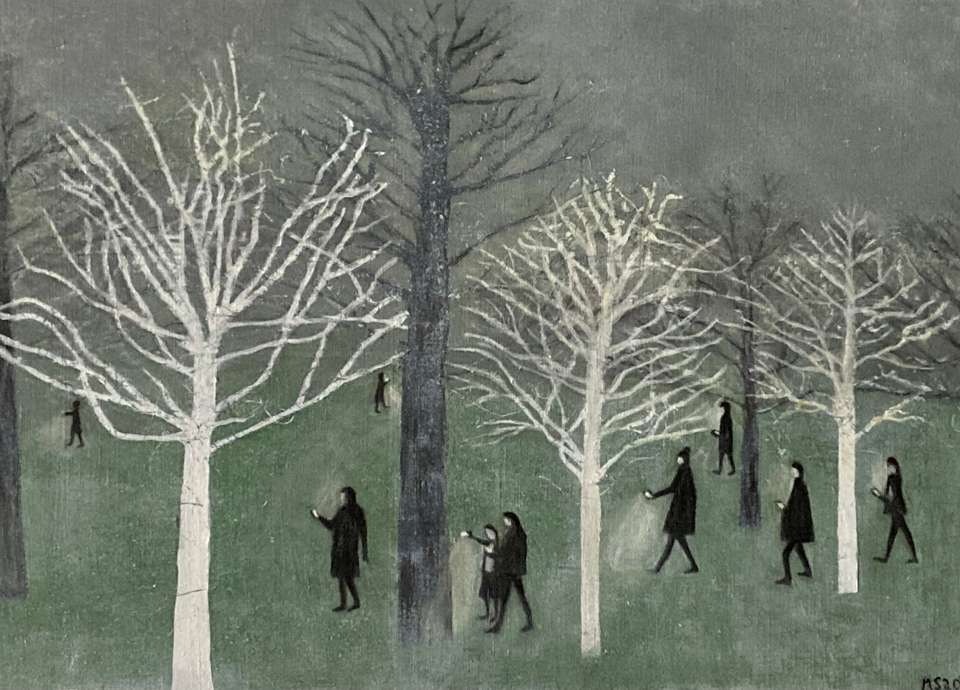 Notes on the Artwork: Inspired by seeing people using phones and heading towards a bonfire night event. Some talking to people there, some talking to people by phone.