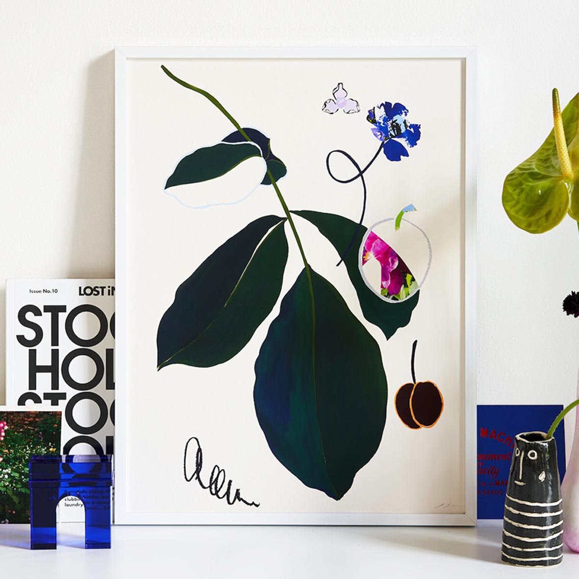 A print depicting artwork which has been created in Lucie's studio with a mix of drawing and painting techniques including gouache, acrylic, oil pastel, photographs and cut paper.