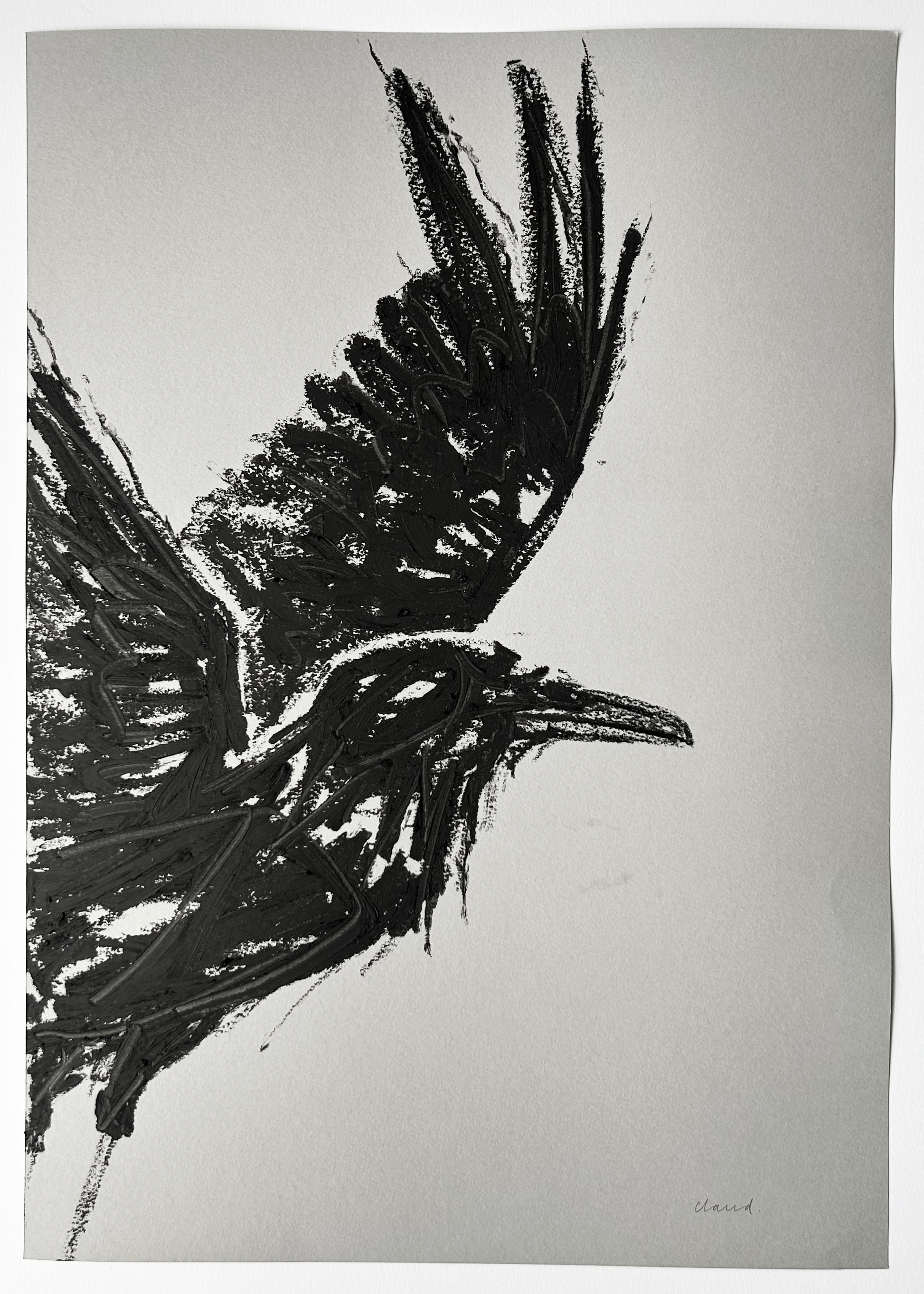 Notes on the Artwork: Part of an ongoing series of crow studies. The series explores the behaviours and personalities of the humble crow, a bird which is so familiar to all of us but often unnoticed. The medium of oil stick is textured, leaving a tactile surface and capturing the movement and feathers of each bird. It would look excellent as a feature piece or alongside another of Claud's work found here.