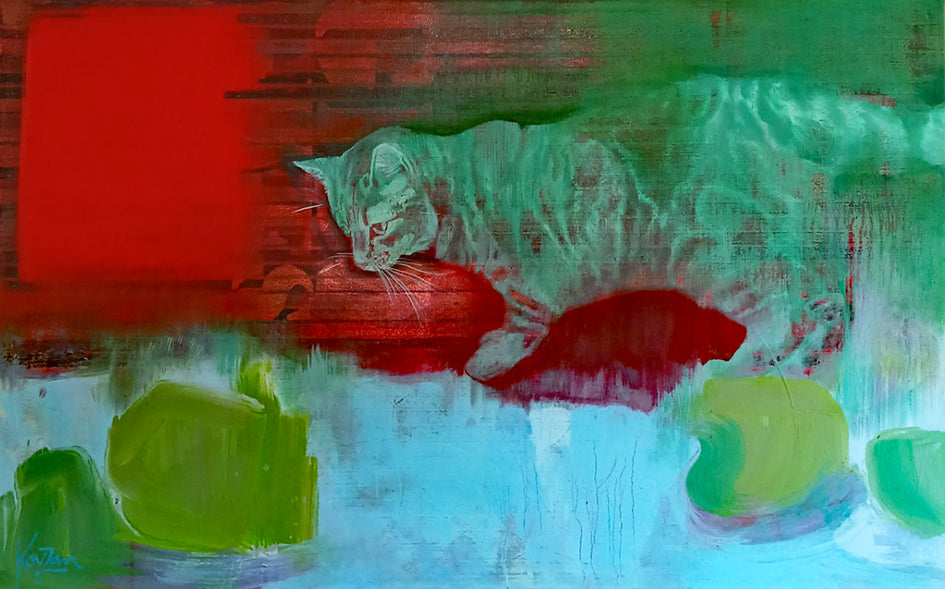 Notes on the Artwork: "A wildlife pond, a cat and a frog. This cat (unknown ownership) visits my small wildlife pond every day waiting for a sign: a bubble, a ripple, a shadow. The frog is there, but it won't be caught. The cat will spend hours waiting, hoping, but never succeeding. It's a tale of determination, obstinacy and never giving up....and it's been a source of inspiration for me after yet another RA rejection!"