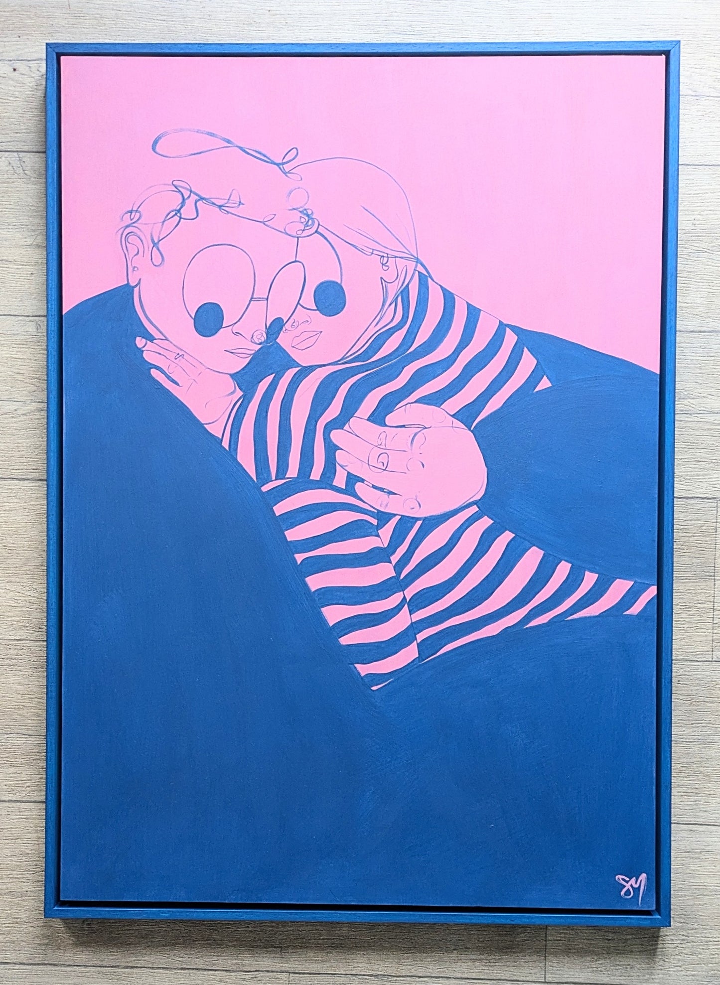 Notes on the Artwork: This artwork features stunning colours and depicts two people in a comforting embrace. It would make a wonderful, bright addition to your living space wall, or even in a bedroom space. Framed in a matching blue frame.