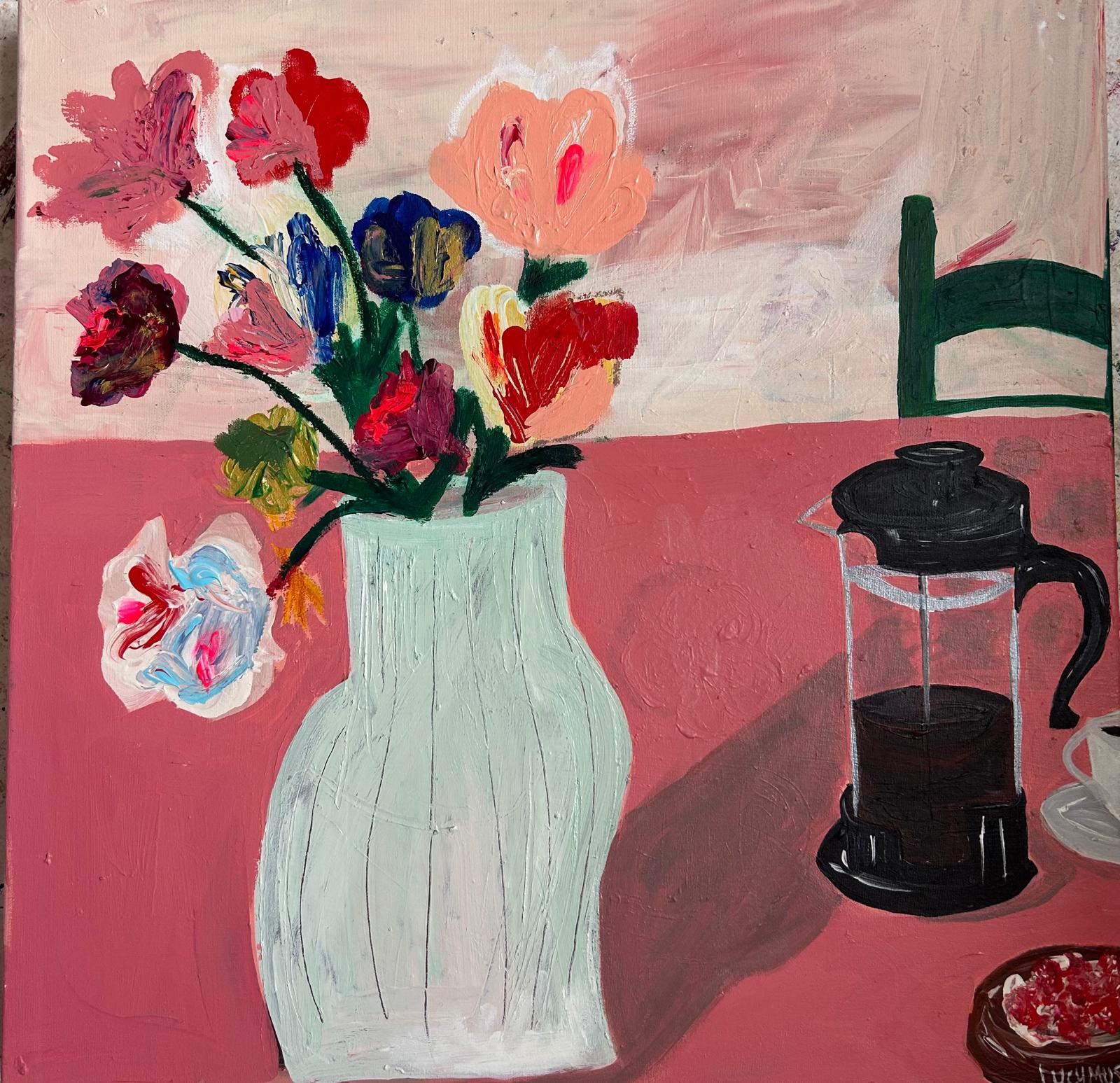 Notes on the Artwork: 'Vibrant original florals, with wild abandon, and coffee! The perfect way to start the day!' This gorgeous still life from Lucy feels warm and familiar. We can imagine this piece becoming a brilliant focal piece in a dining or kitchen area.