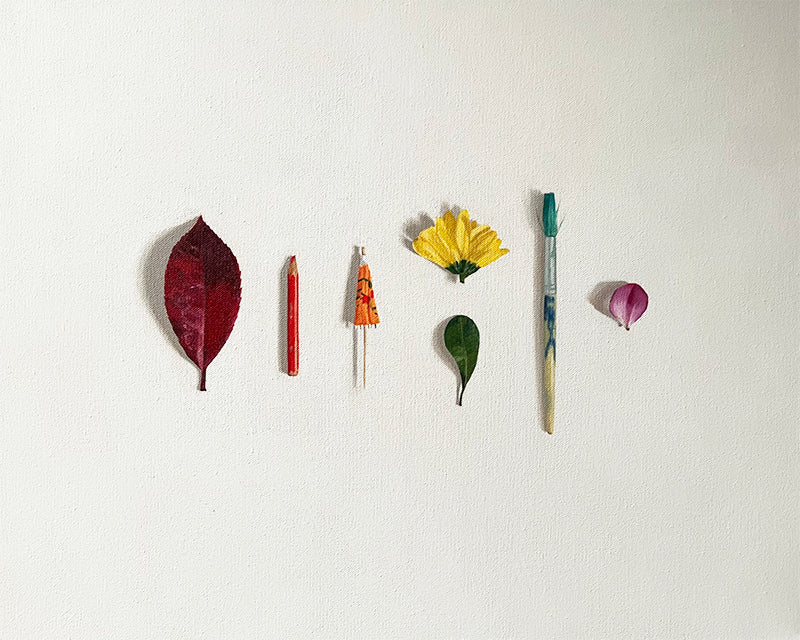 Notes on the Artwork: An original oil painting on canvas, with a selection of found plants and objects in a rainbow cluster.