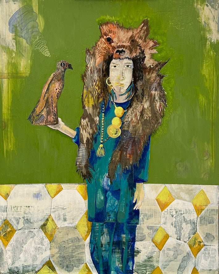 Notes on the Artwork: A portrait of Tina dressed in her wolf outfit conversing with her ceramic kestrel in her kitchen in Patcham, East Sussex. Framed in a water gilded strip, tray frame.