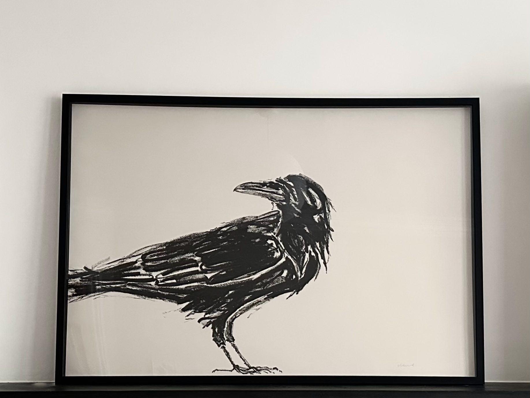 Notes on the Artwork: Part of an ongoing series of crow studies, this is one of the largest scale drawings in the collection. The series studies the behaviours and personalities of the humble crow, a bird which is so familiar to all of us but often unnoticed. The medium of oil stick is textured, leaving a tactile surface and capturing the movement and feathers of each bird. It would look excellent as a feature piece. See more of Claud's work here.