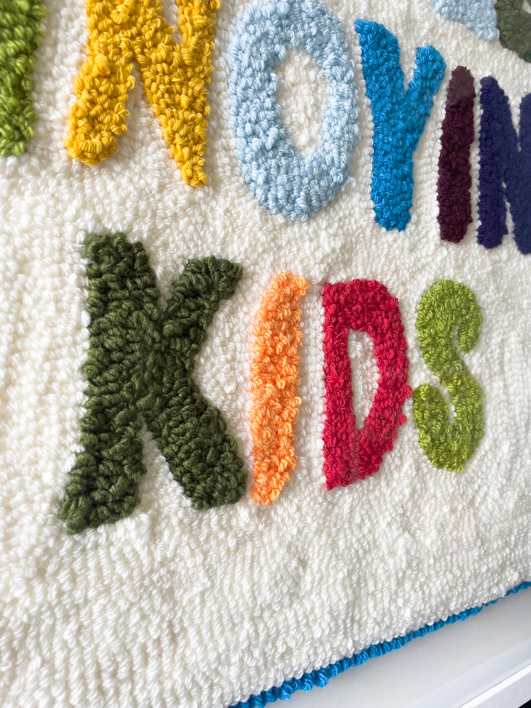 Handmade textile type piece made with colourful tufted wool on a monks cloth backing.