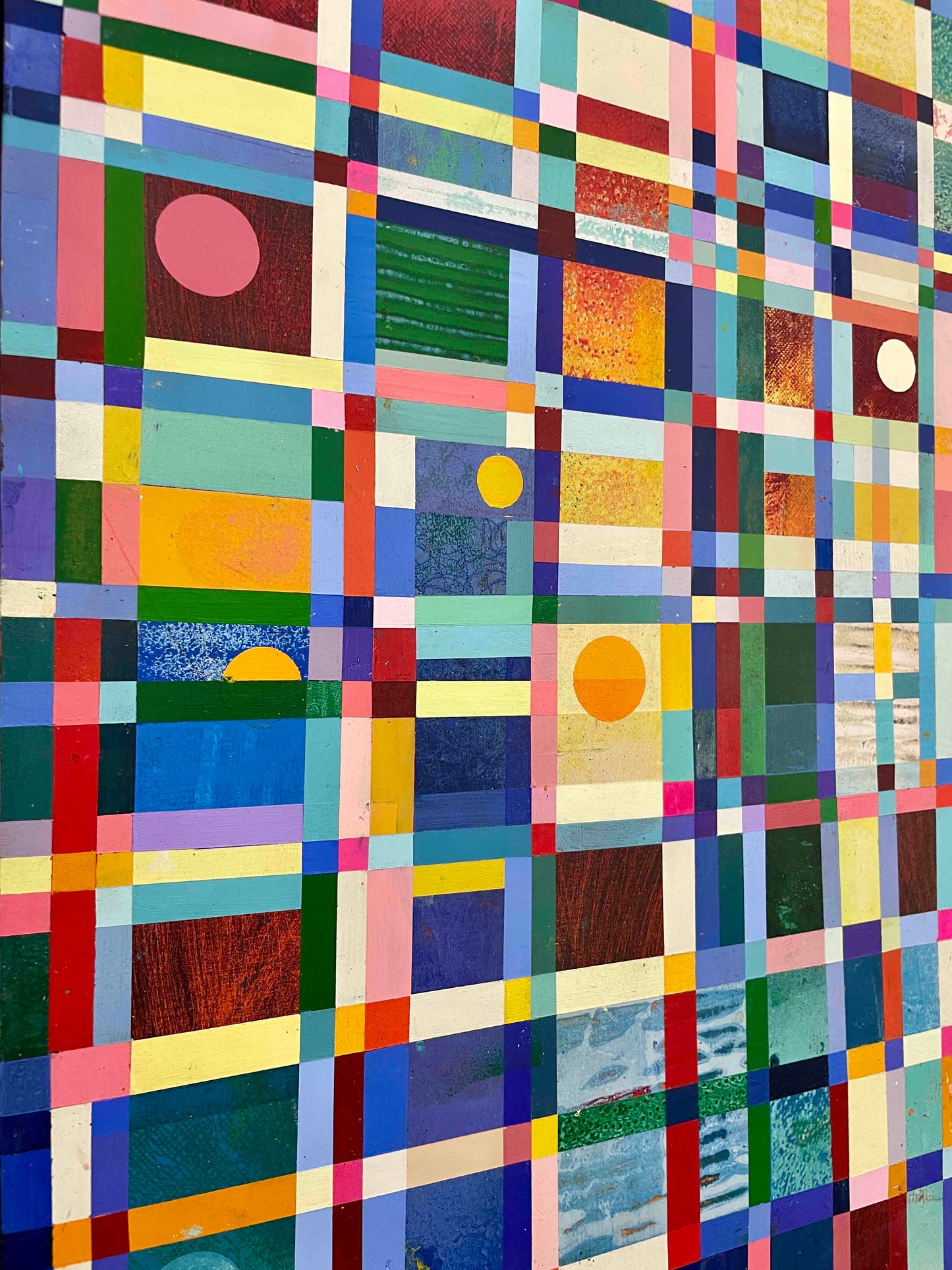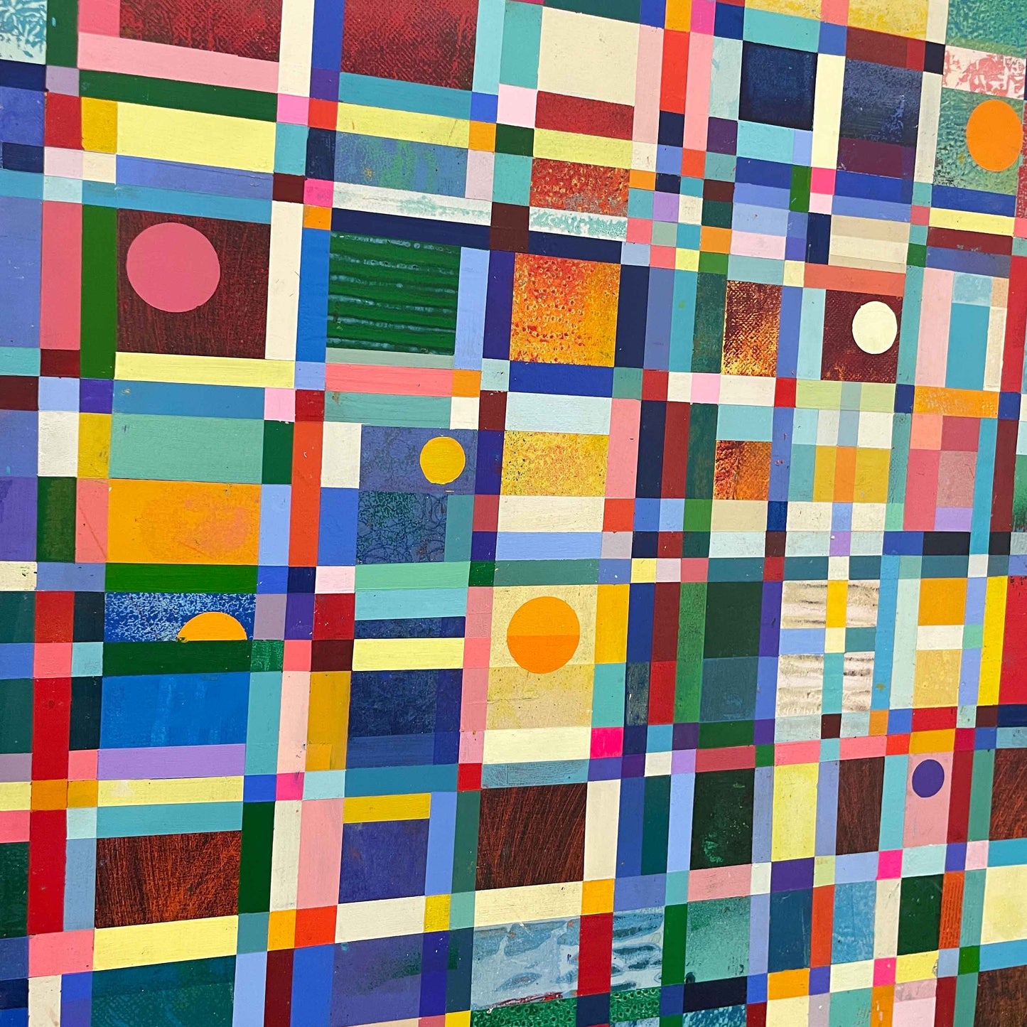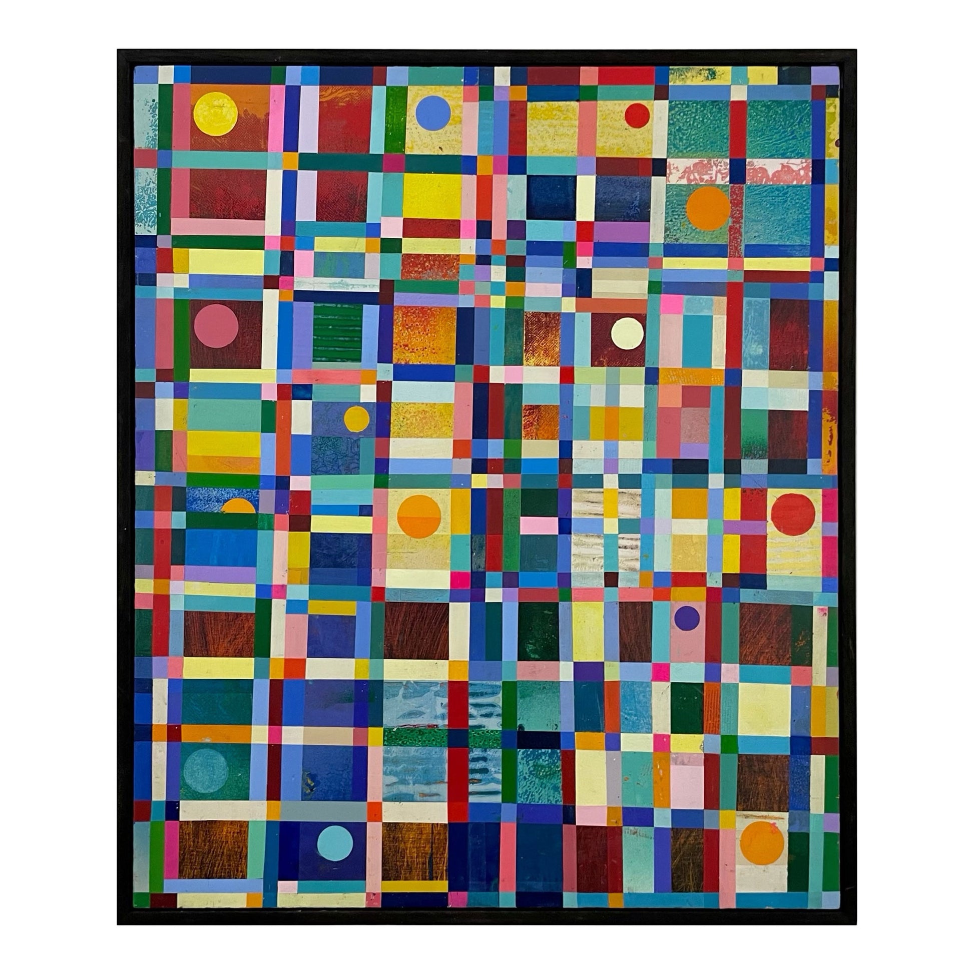 Notes on the Artwork: In classic Matt Dosa style, this bold abstract artwork features intricate layers of acrylic, spray paint and texture. With its vibrant colours and grid-like composition, it's a true statement piece that will bring energy and life to any room.