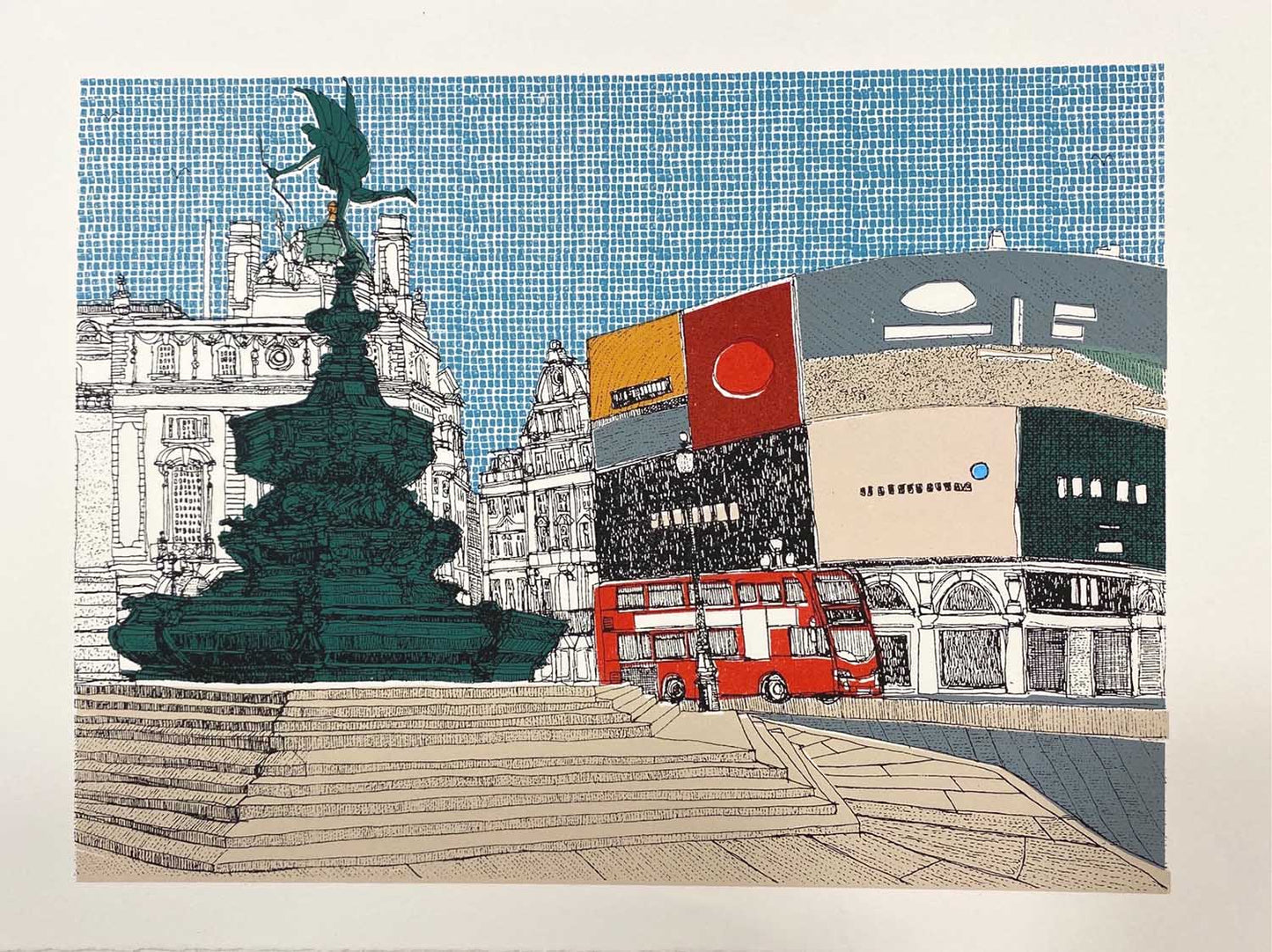 Notes on the Artwork: View of Piccadilly Circus showing the infamous statue, commercial signs and red buses.