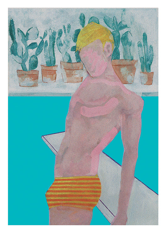 A celebration of Summer. The perfect man in the perfect setting. An examination of queer identity amongst the swimming pool culture especially prevalent in Los Angeles. With nods to David Hockney, the image of a perfect body rising out of water is one of the great fantasies of European art. This faceless man becomes an object of decoration himself. A holiday romance of sorts.