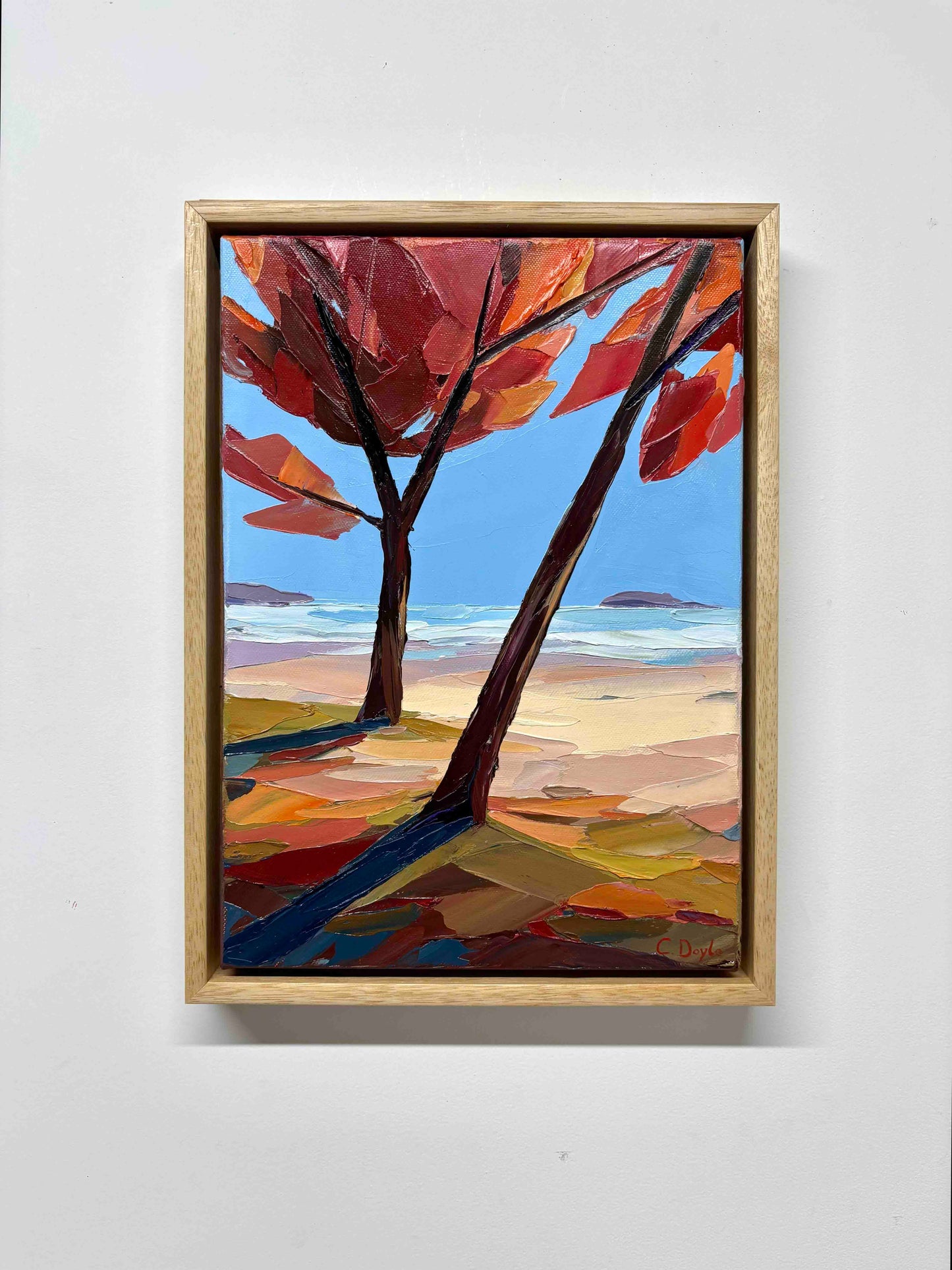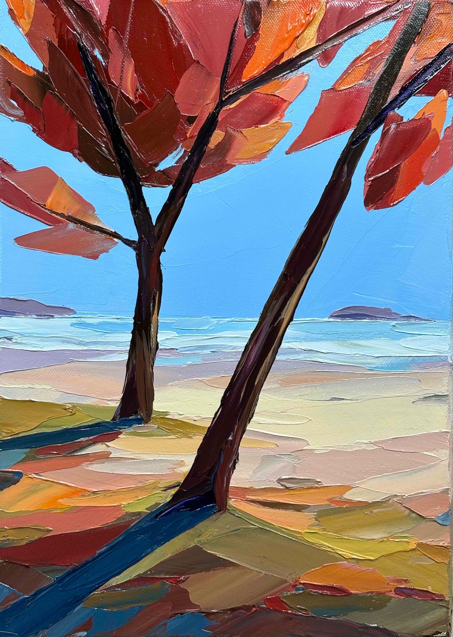 Notes on Artwork: Add warmth and elegance to your space with this vibrant autumn landscape. Bold, textured strokes of crimson and orange foliage contrast with a serene blue sky, creating a striking focal point. Perfect above a sofa or fireplace, this piece brings energy, tranquility, and a touch of nature-inspired charm to any room.