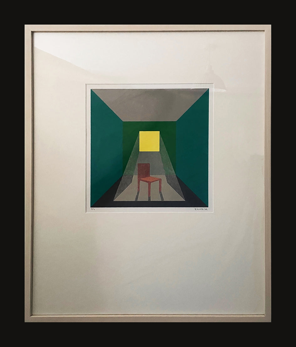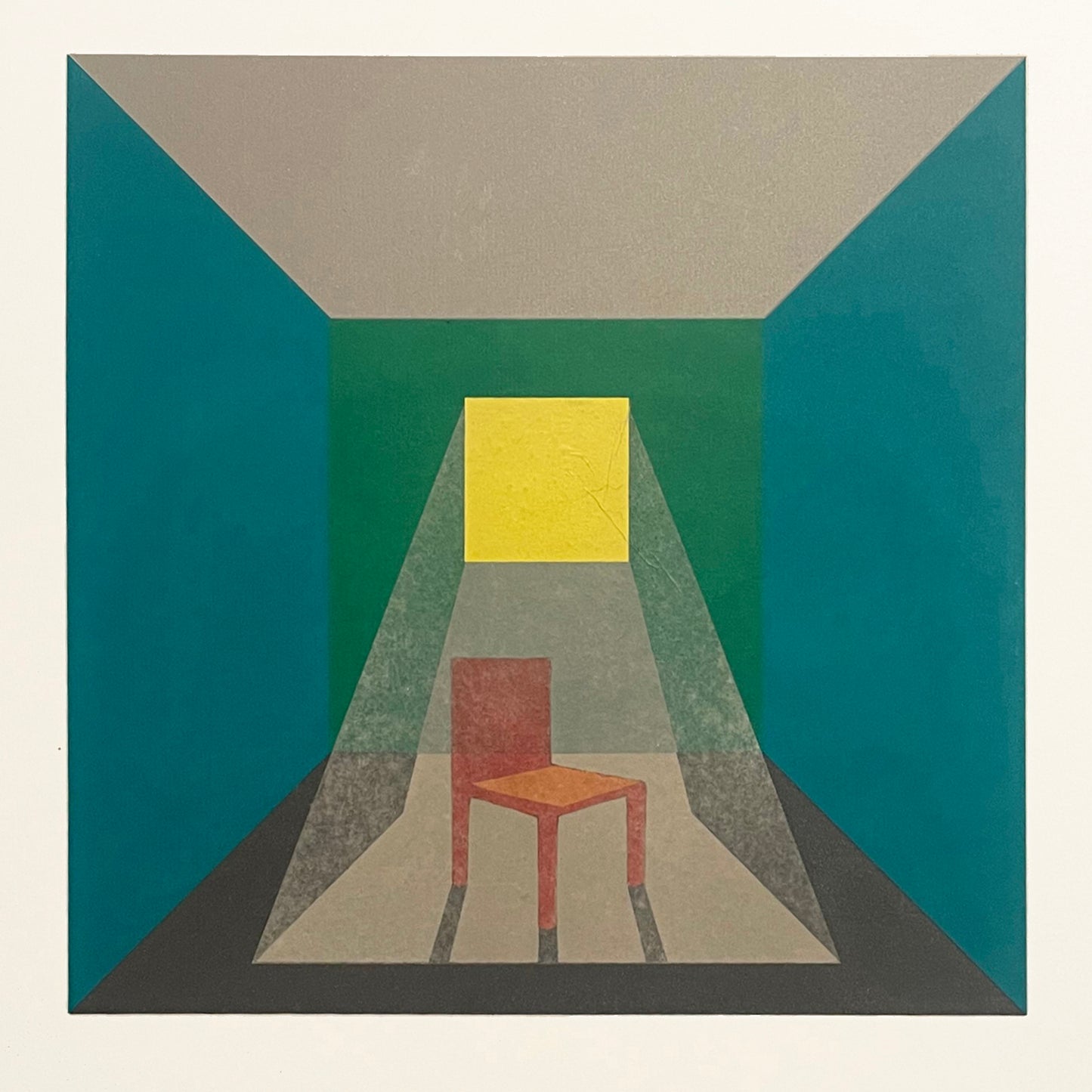 Notes on the Artwork: Red Chair is a limited run (25) hand-finished screen print. The room is screen printed, the chair is hand painted and then a piece of Japanese tissue paper is laid on top to give the light effect.