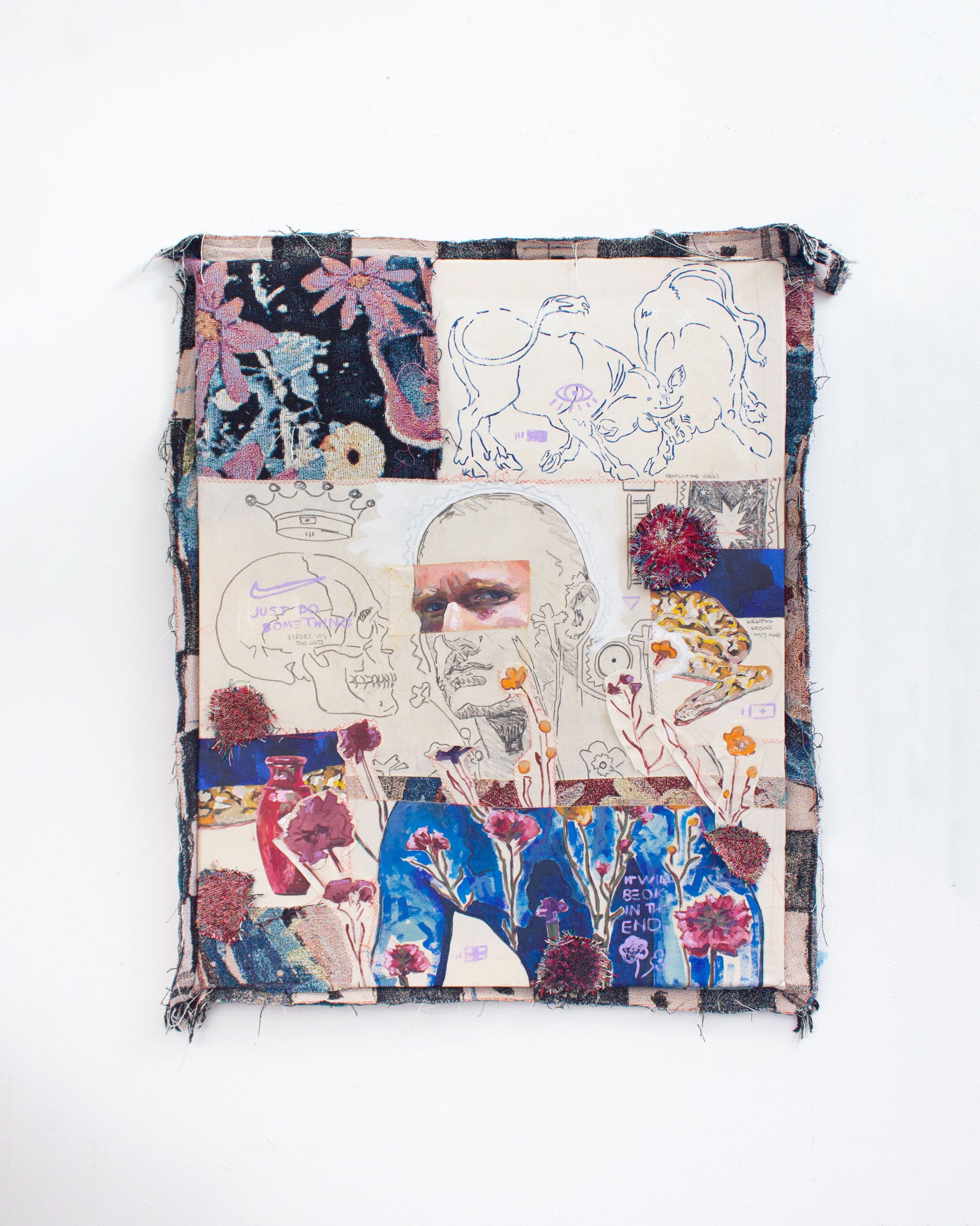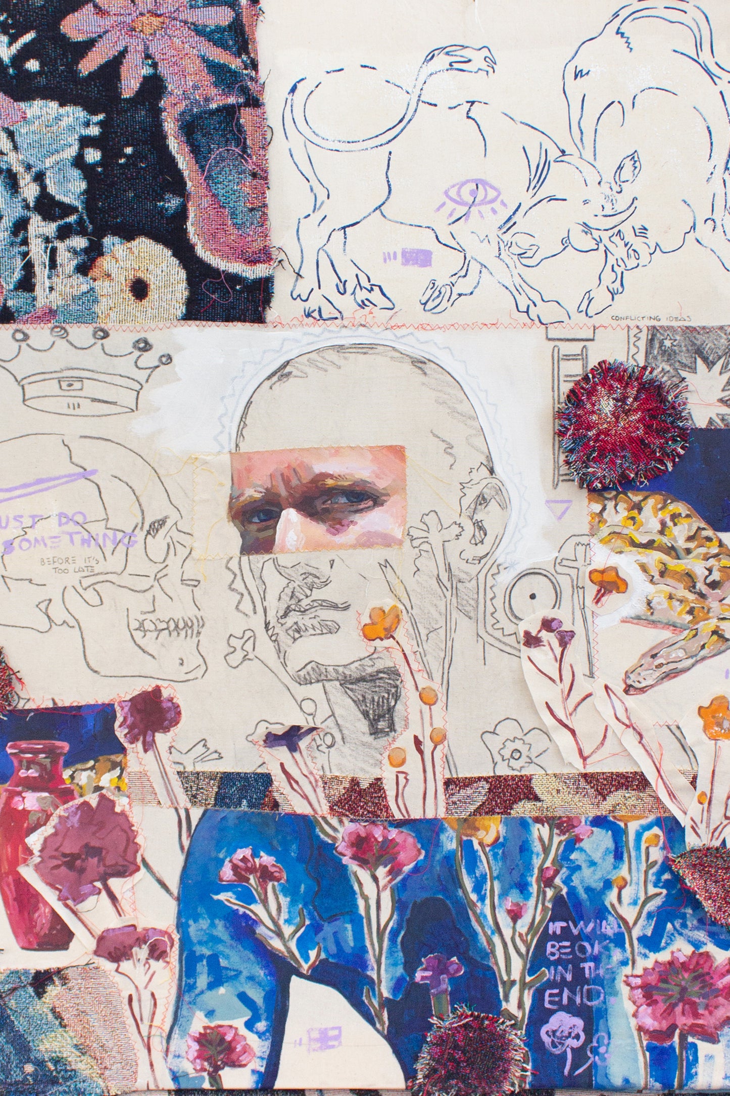Original artwork created using mixed media: acrylic paint and charcoal on woven tapestry and canvas