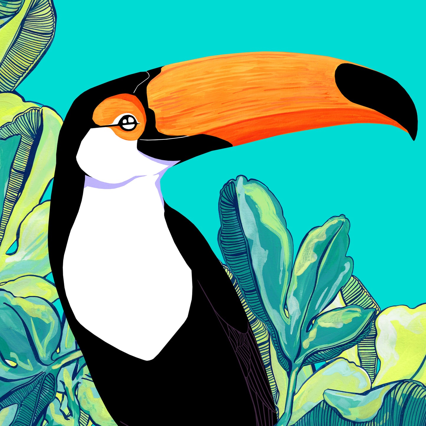 Notes on the Artwork: "Toucan and Fig Tree - Inspired by my love of birds and a desire to retain the happy feeling of summer all year long. Every element has been hand painted, taking six months from the initial sketches to the final piece. You can see the hand painted brushstrokes in every part, which emphasises the areas of heavy detail in the leaves contrasted with the stark bold simplicity of toucan."