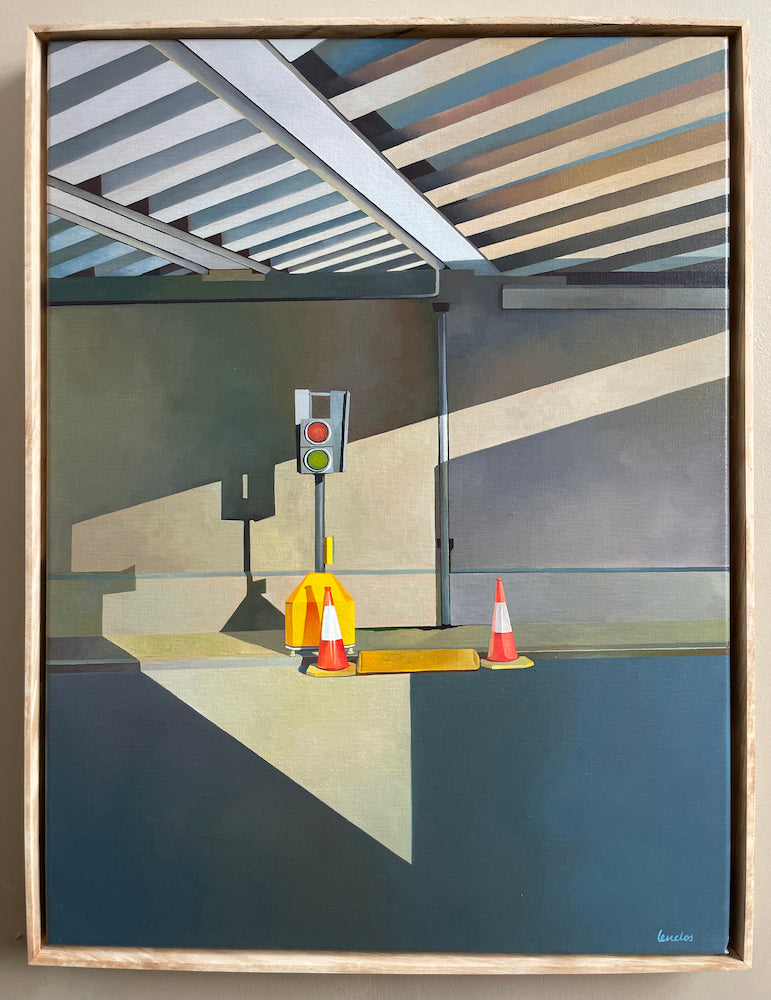 Notes on the artwork: "I have painted the wall under the bridge by my studio a hundred times. I love the way the light sets a scene where the temporary traffic light is the main actor."